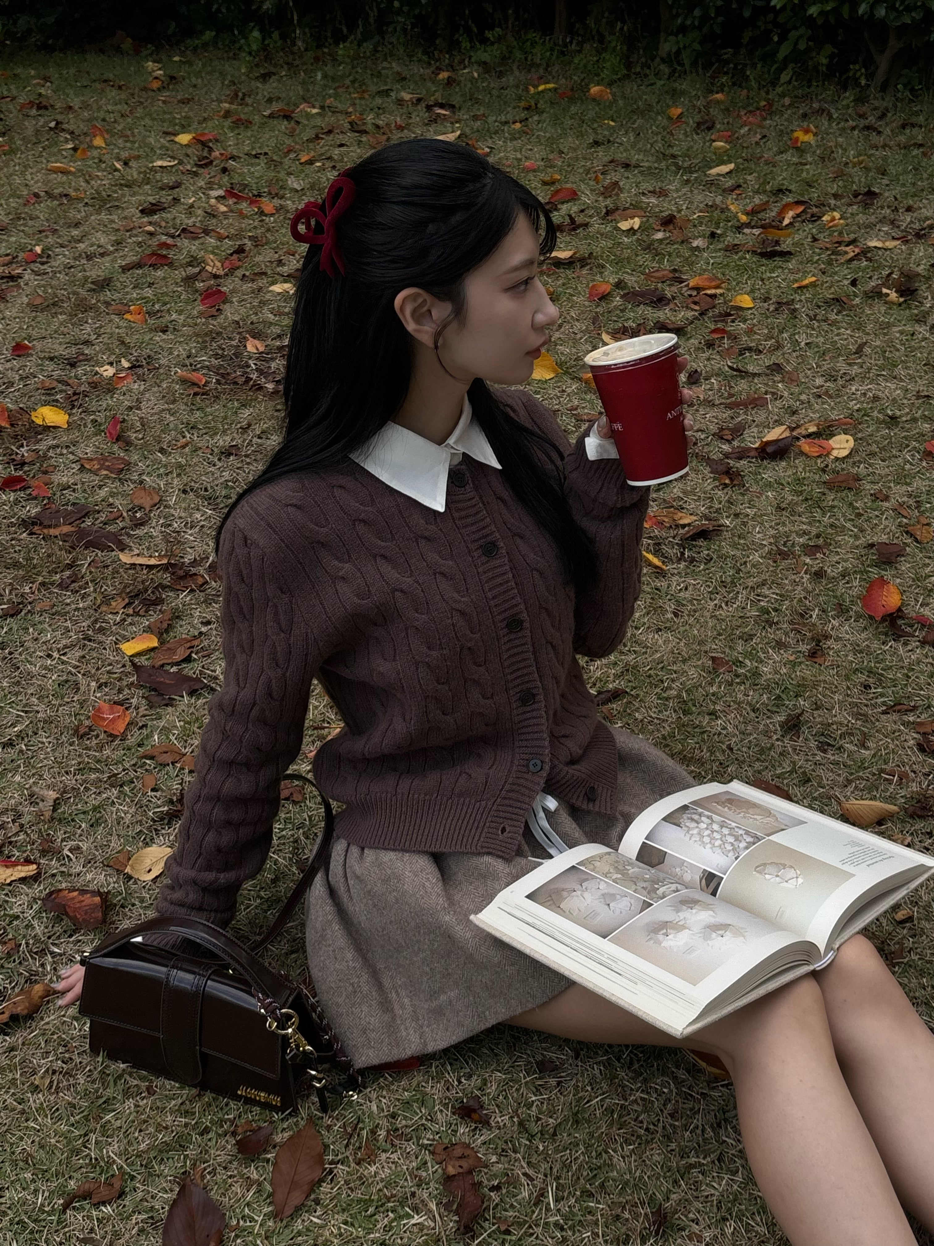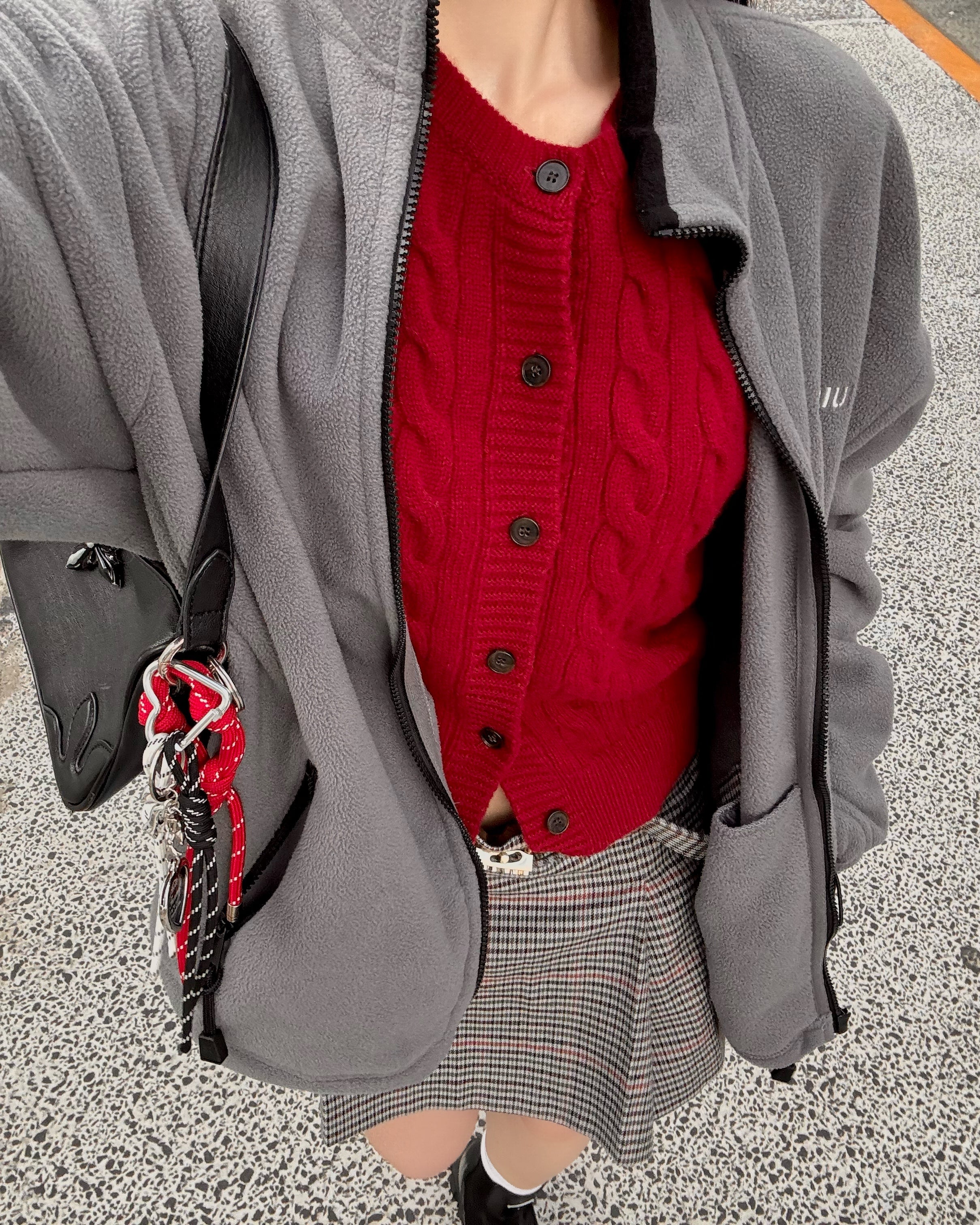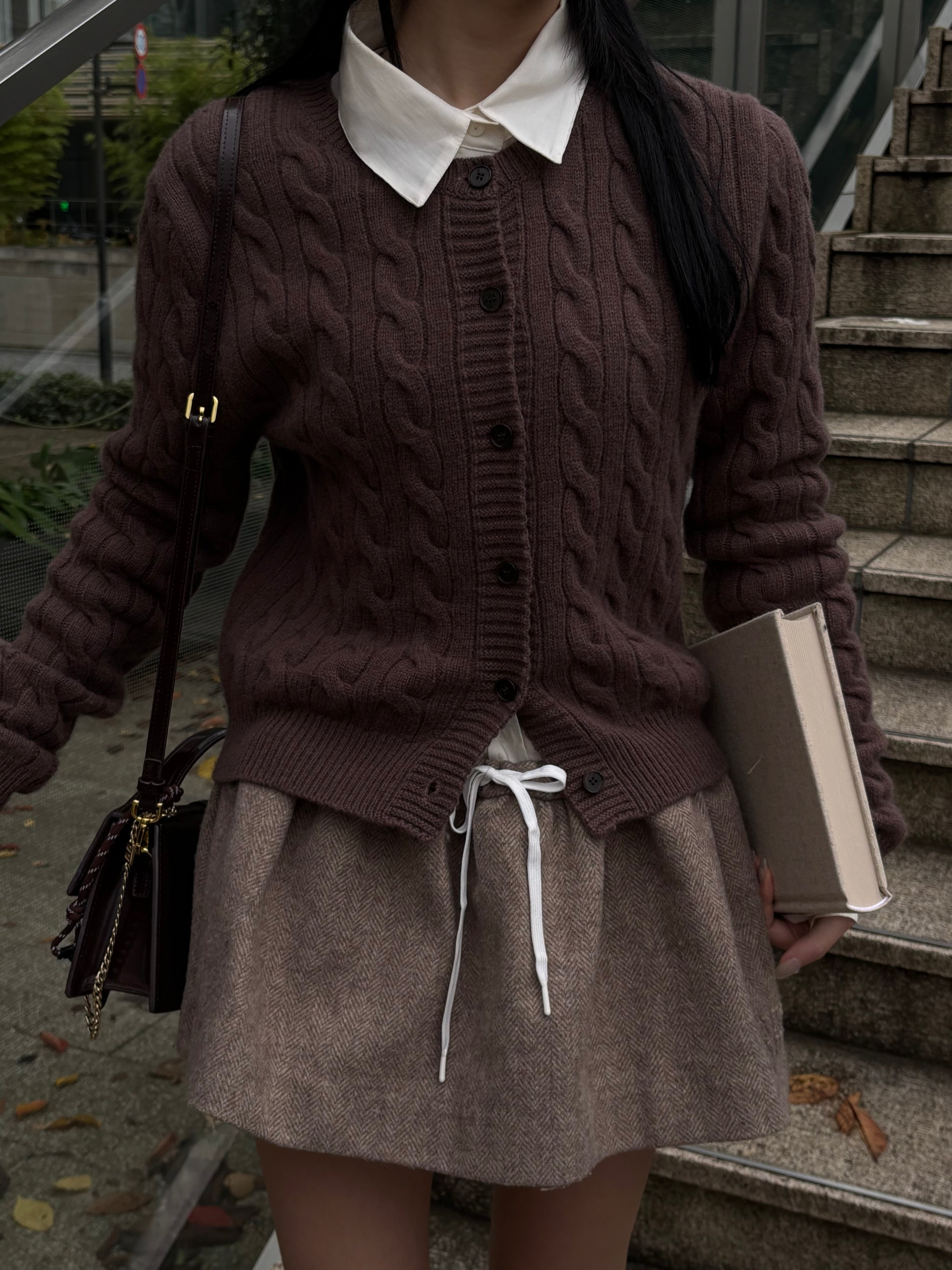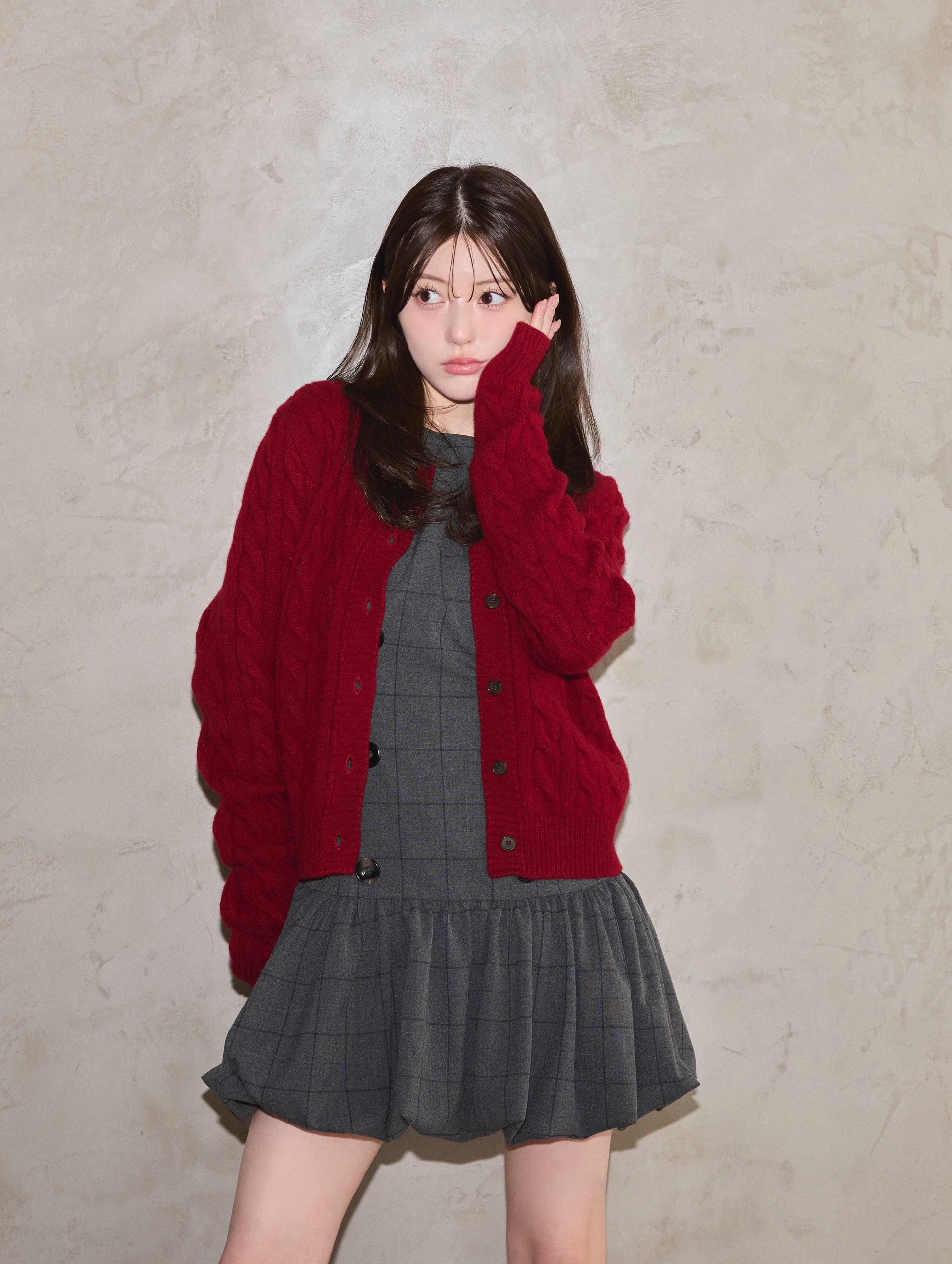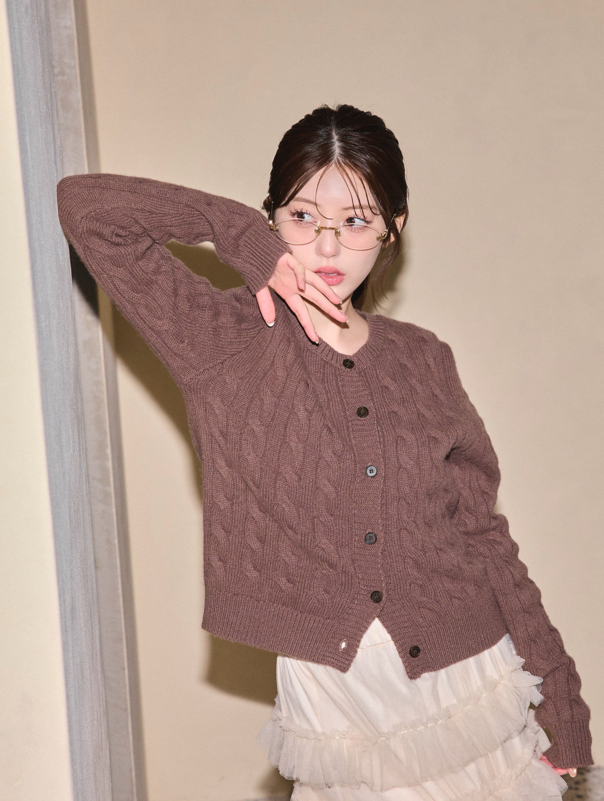 規則正しく編み込まれたケーブル模様が浮かぶニットカーディガン。
