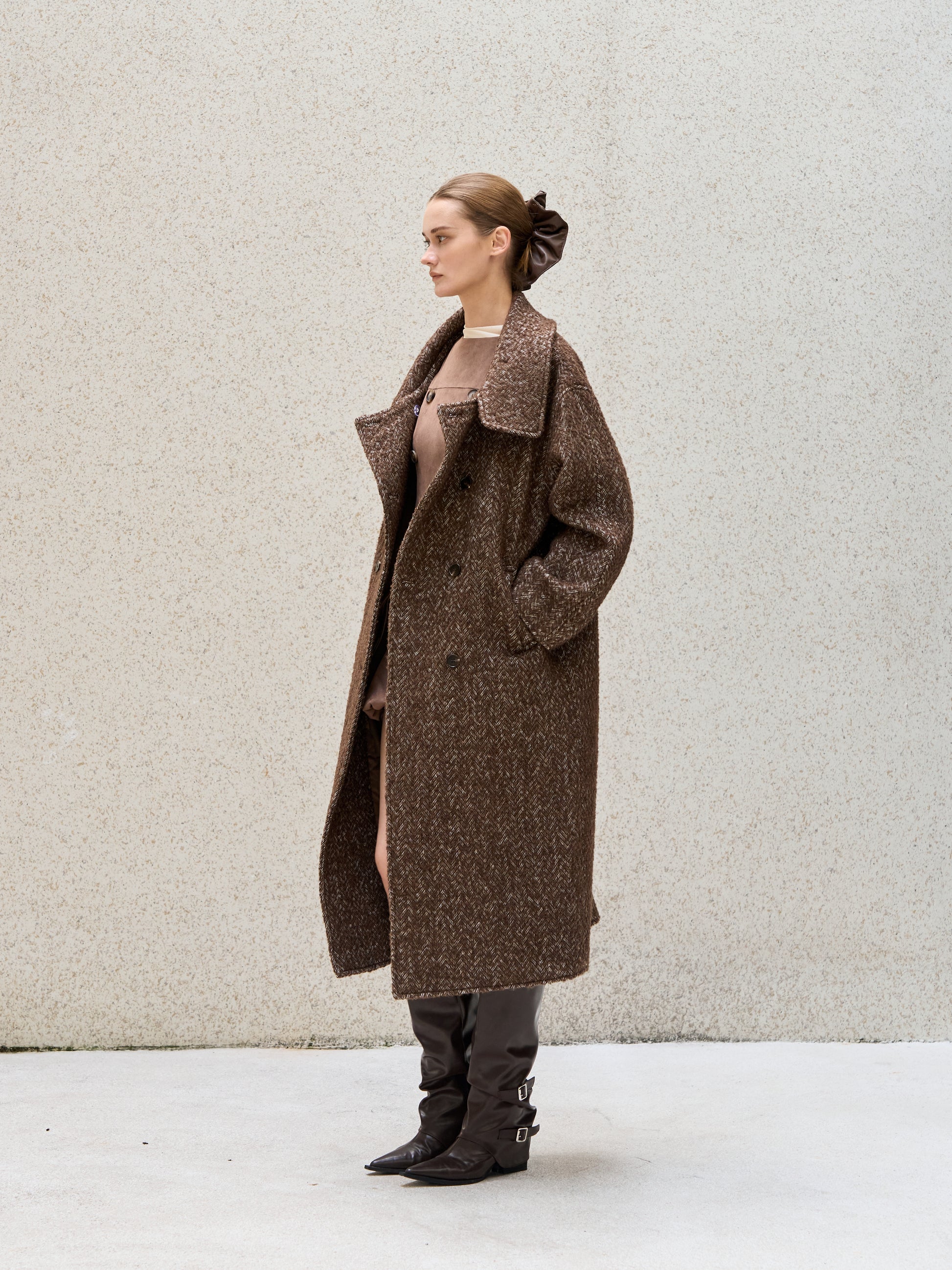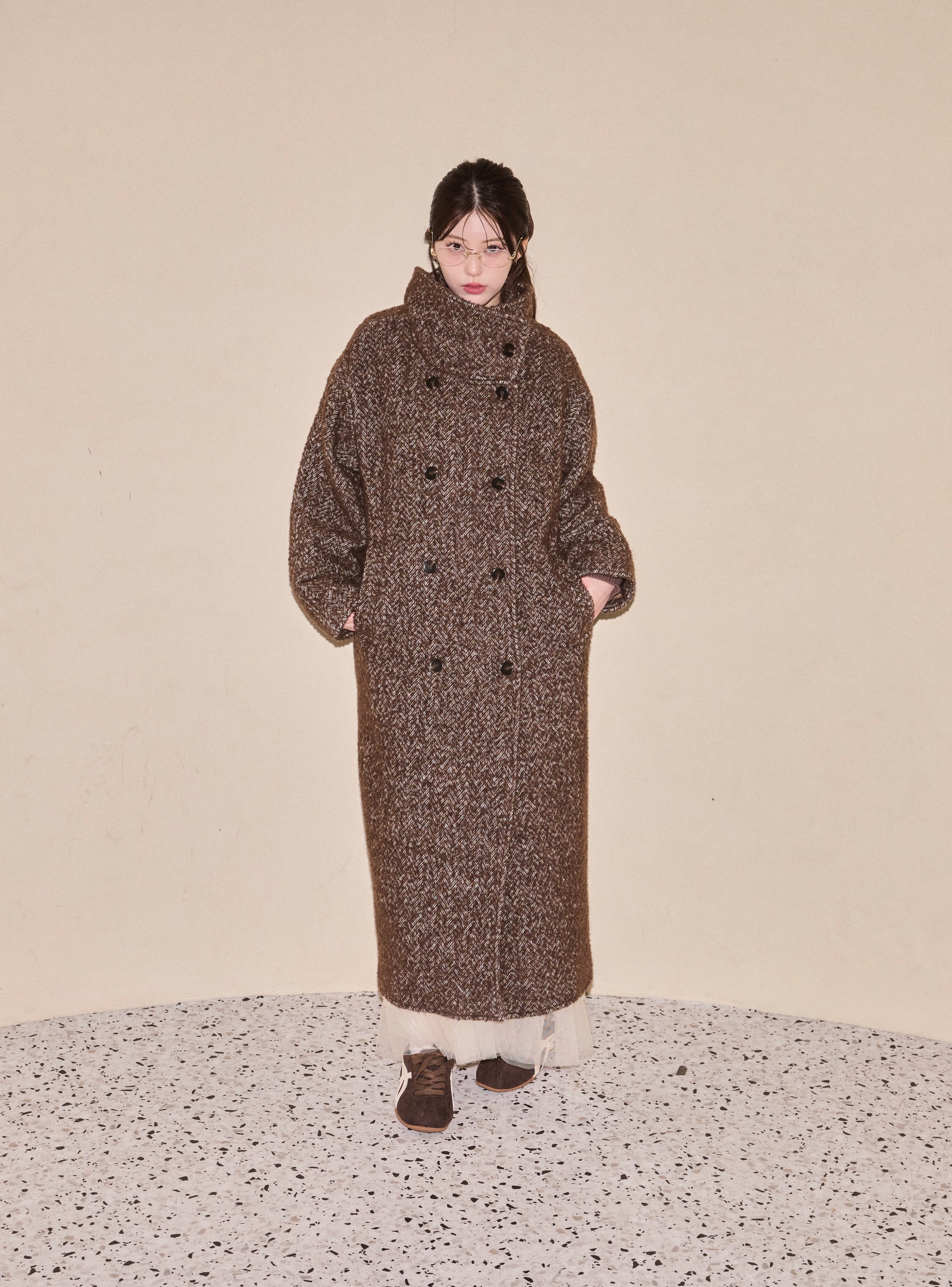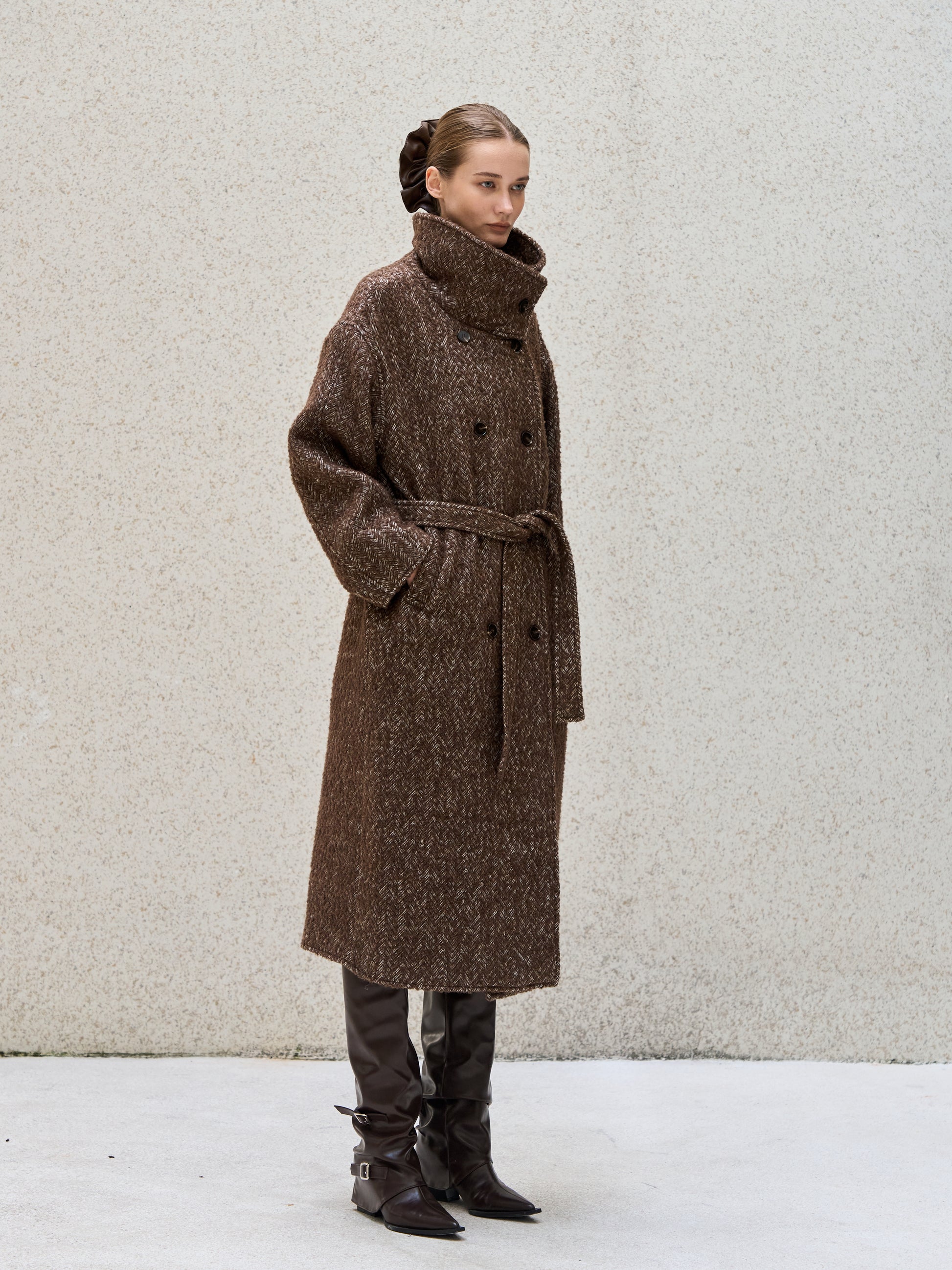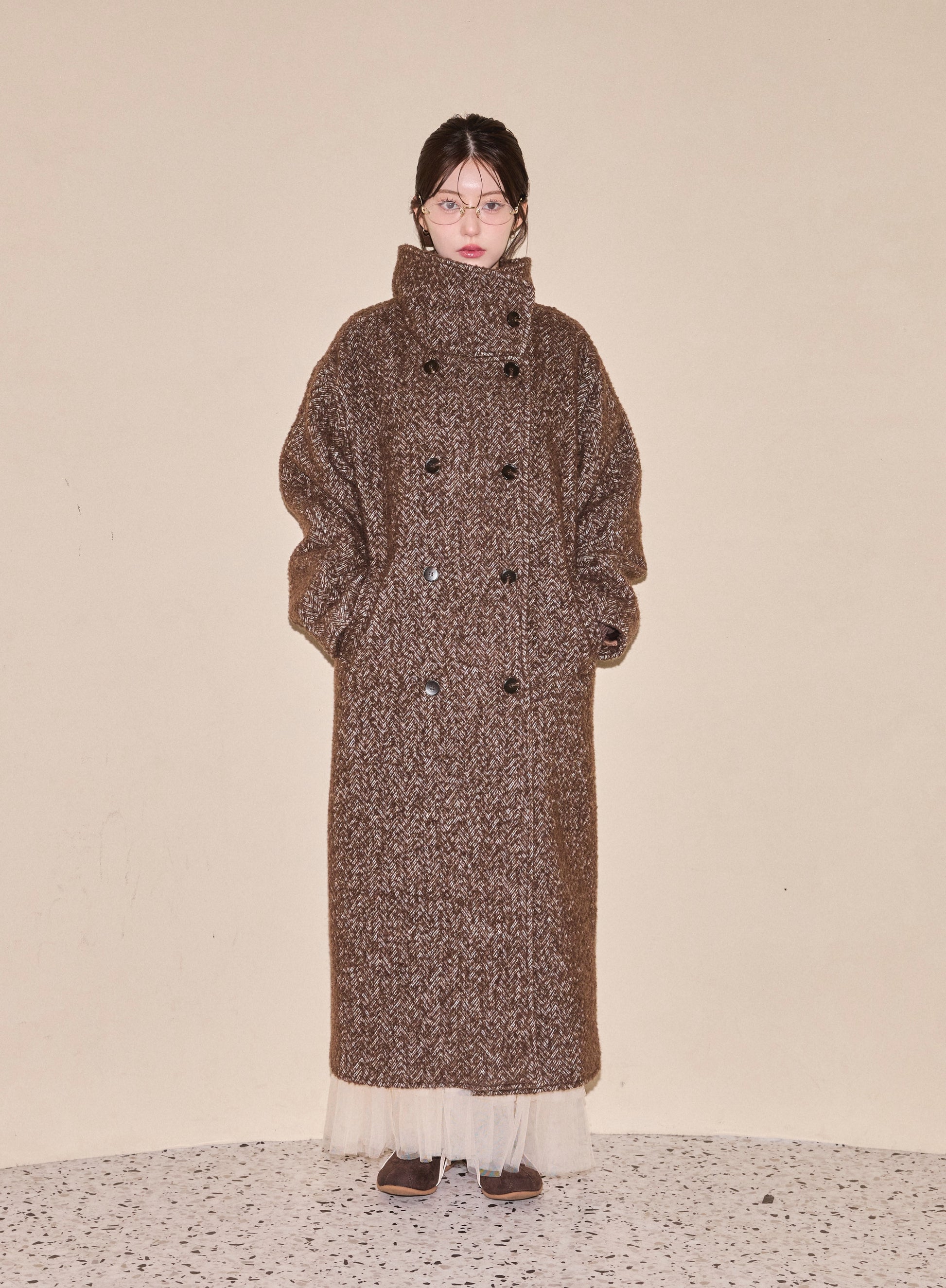 重厚なヘリンボーン生地を贅沢に使用し、構築的なシルエットを描いたロングコート。