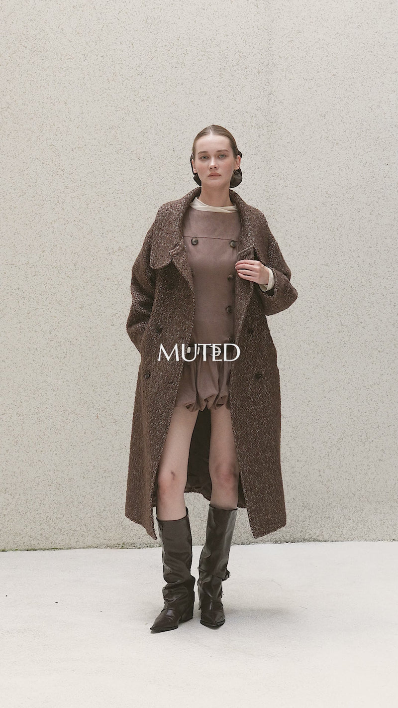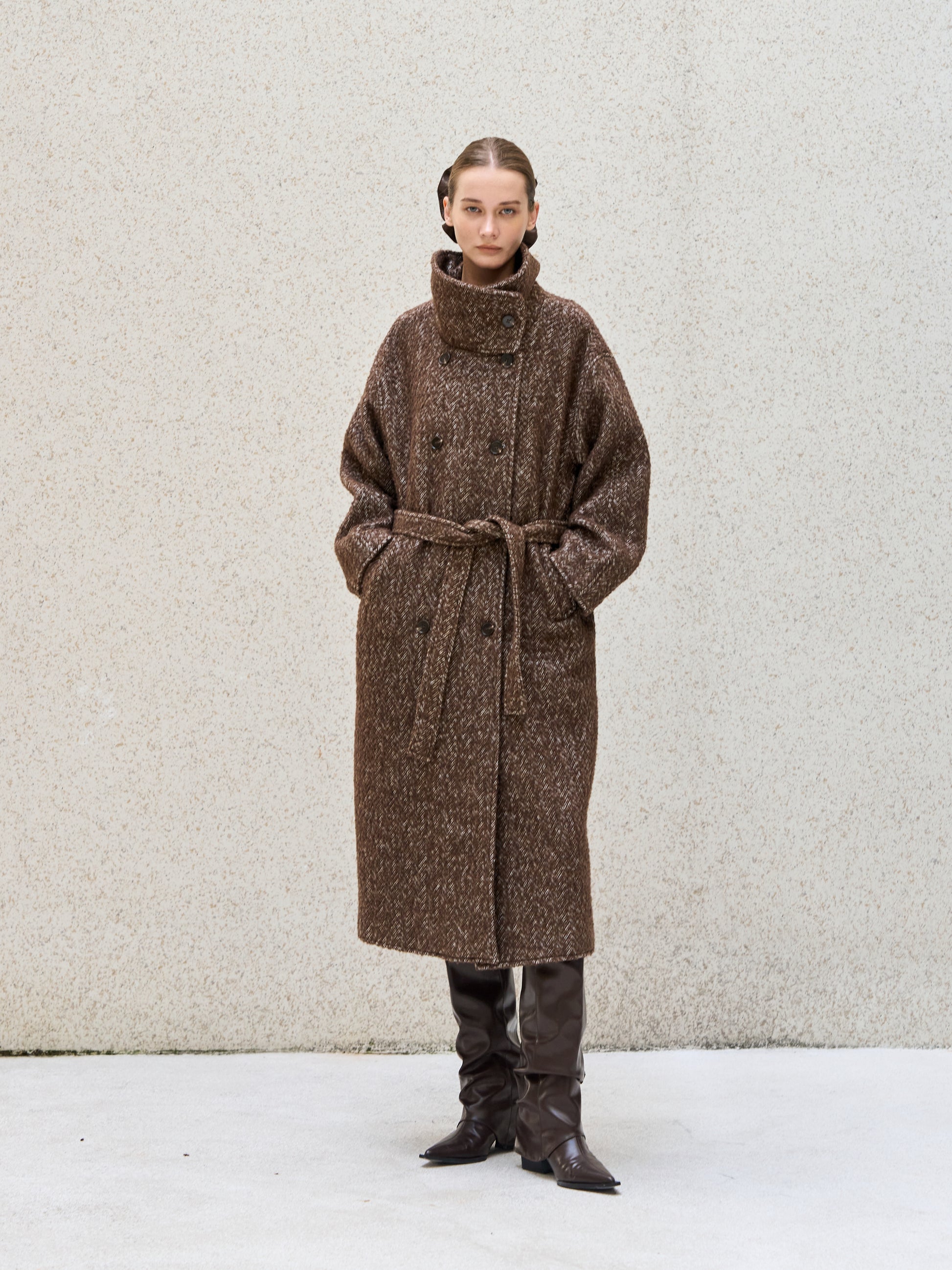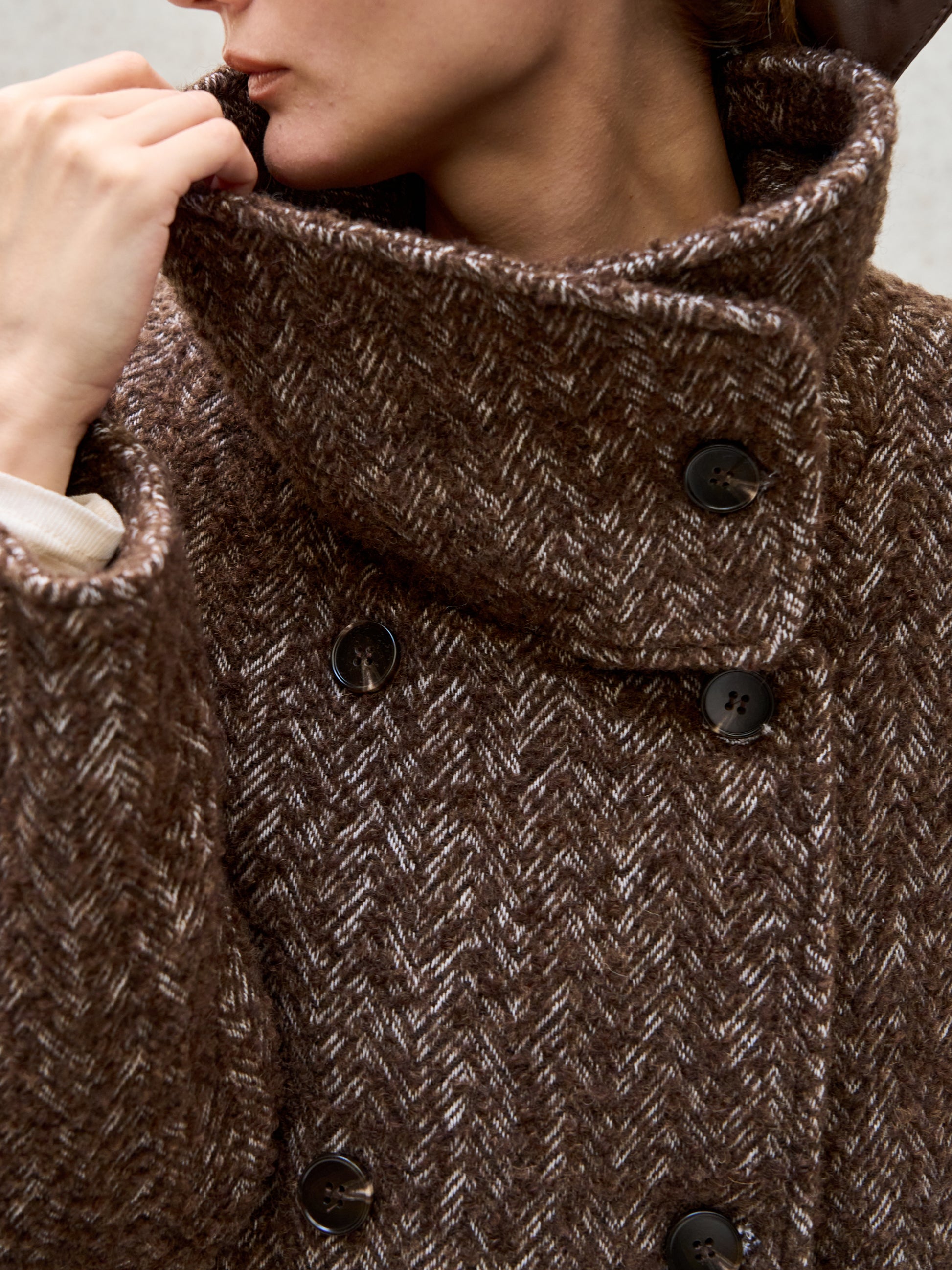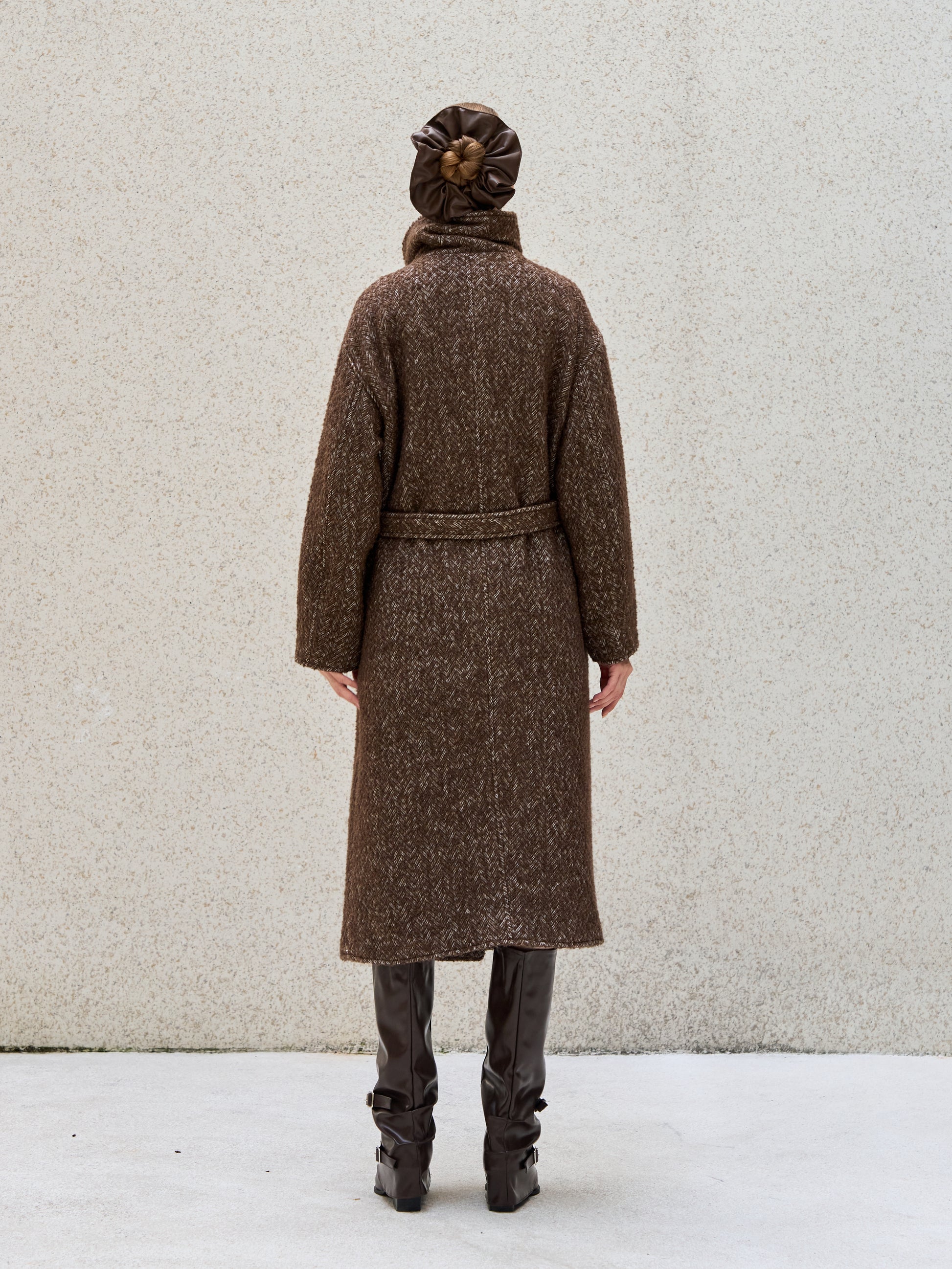 重厚なヘリンボーン生地を贅沢に使用し、構築的なシルエットを描いたロングコート。